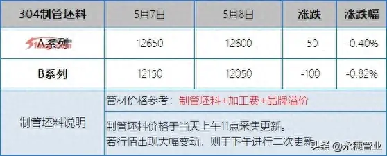 較昨日早間,今日早間市場201報價多數持平,個別下跌50元/噸;304報價下跌20-50元/噸,個別高位下跌100元/噸,目前主流報價區間:201新料在5850-5950元/噸;304新料在10400-10500元/噸。