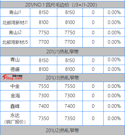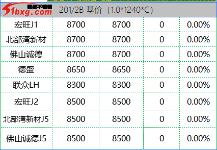 今日,青山代理報,J1-8150元/噸,J3-7950元/噸,J4-8650元/噸,J2-7750元/噸,交貨期仍是3月10日前。市場貿易商整體報價波動不大,但價格依然有高低不一呈現。可見報價有,鼎信J2不含稅報價7120-7150元/噸;北部灣新材報J5料7700元/噸,J1四尺8100元/噸,J1五尺8200-8250元/噸(期貨8150);寶鋼BN1TL窄帶7600元/噸,大板7700元/噸;中金J3含稅7530-7550元/噸;中金J5料、金海J3料、鑫峰J3料、永達J3料7380-7500元/噸。