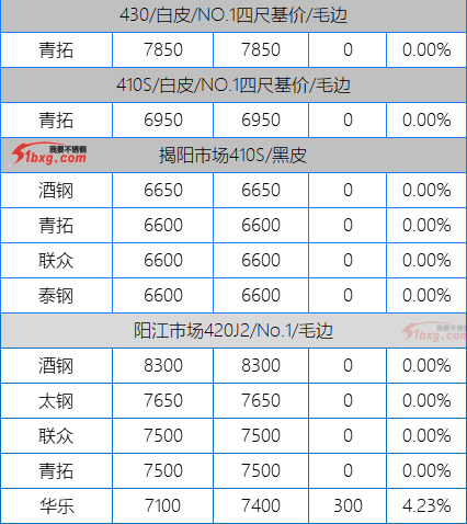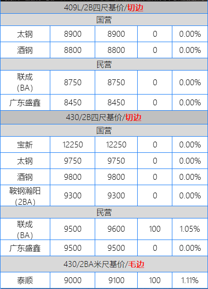 早間,市場報價部分持平,部分繼續有漲100元/噸,目前主流報價:太鋼9700-9800元/噸、酒鋼在9750-9850元/噸、聯眾430/2BA在9200-9500元/噸。